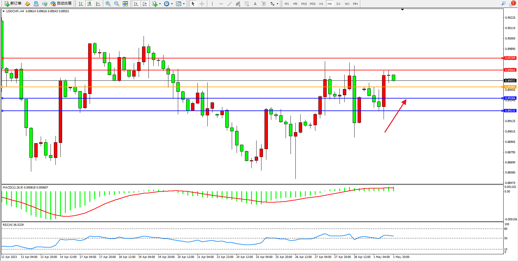 美元瑞郎USDCHF——4小时K线图显示: