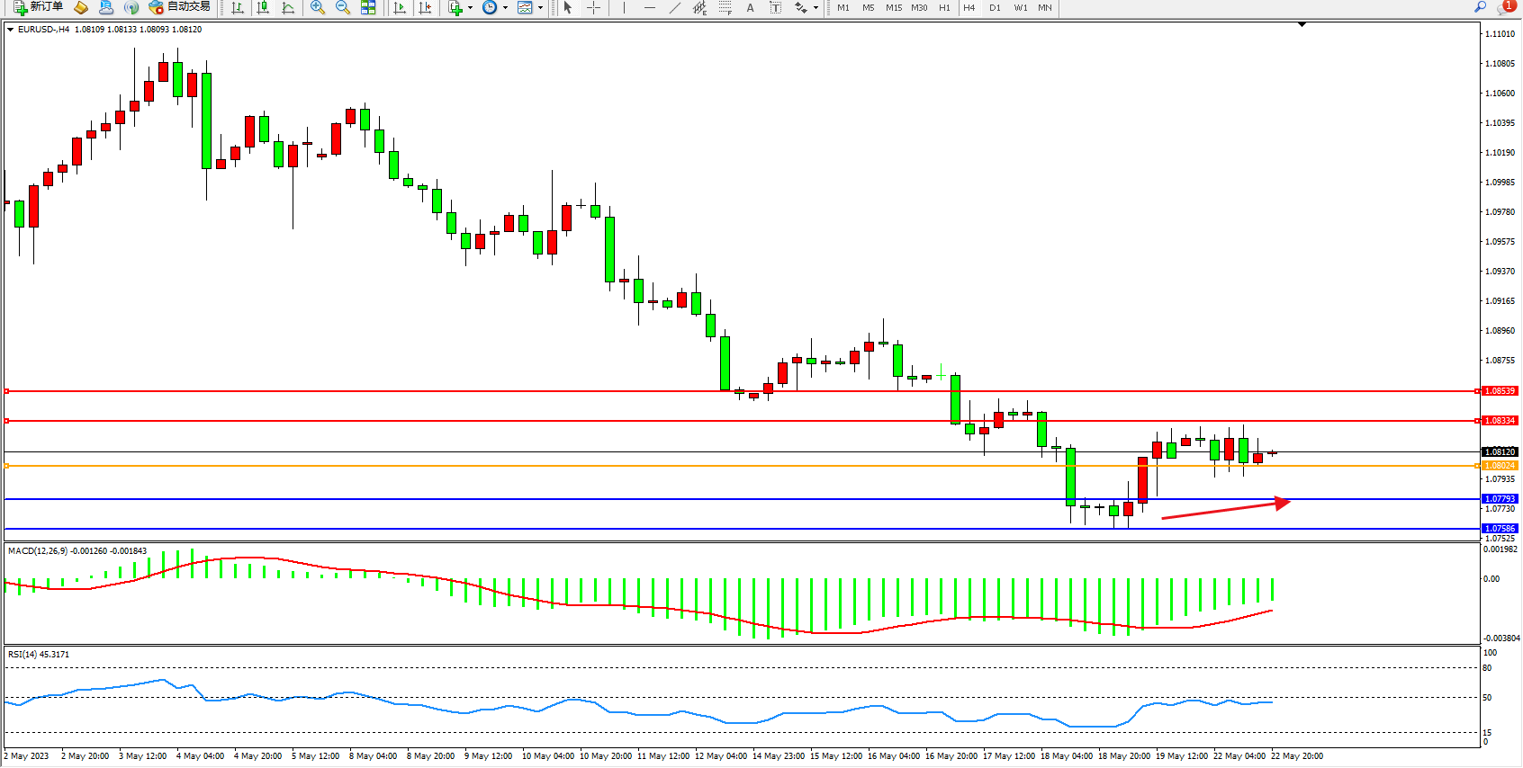 备选策略:1.08024下方看跌,目标1.07793  1.07589