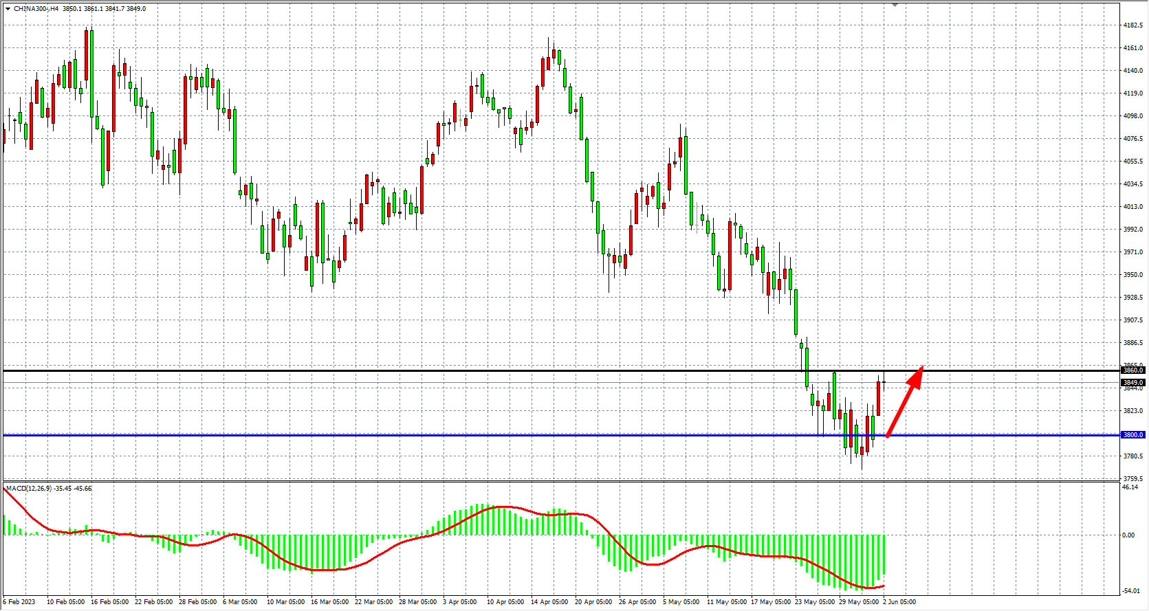 4小时图看,沪深300在3800之上进一步上攻,阻力位于3860附近,MACD量能在零轴下量能缩小,趋势有望迎来突破,重点关注3860阻力,破位上看3900-3950。