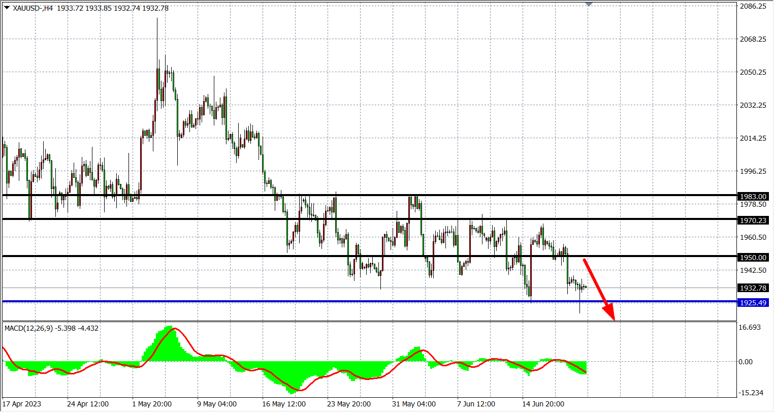 4小时图看,黄金在1950下进一步回调,MACD量能在零轴之下维持放量,空头走势偏强,支撑继续关注1925,阻力关注1950附近。