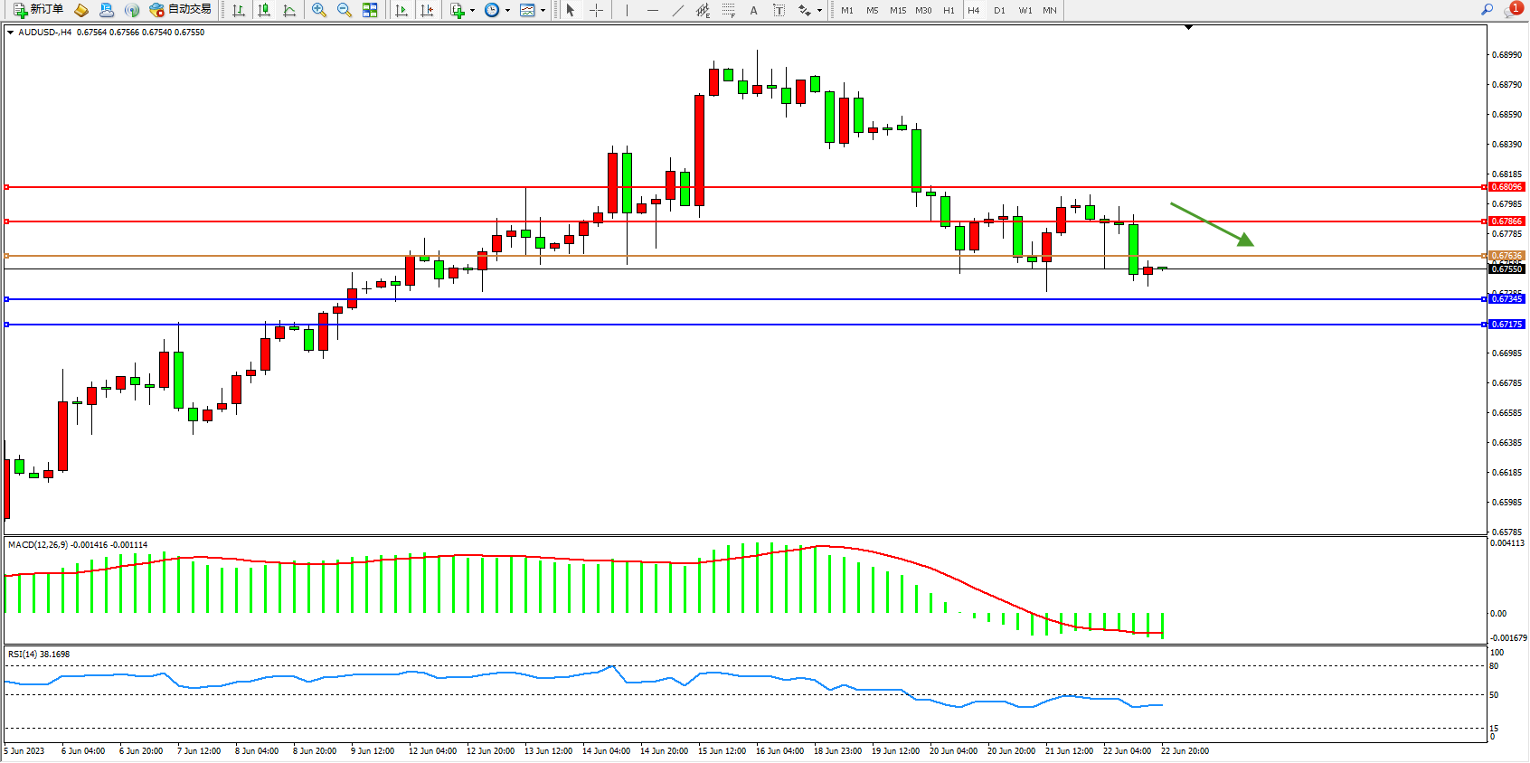 交易策略:0.67636下方看跌,目标0.67345 0.67175
