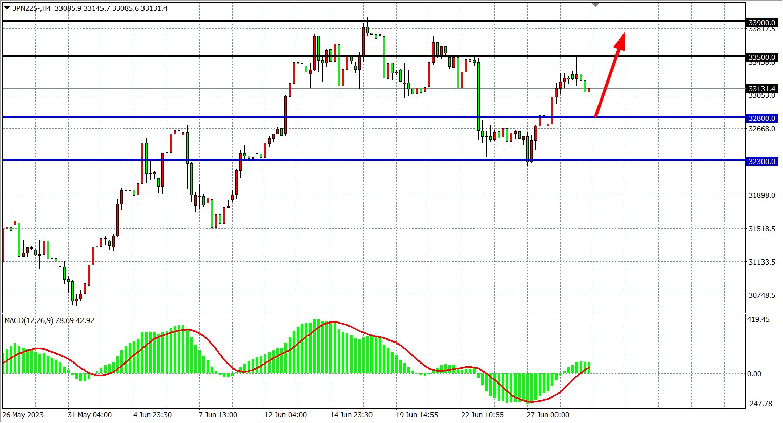 4小时图看,日经指数在33000之上继续走高,MACD量能于零轴之上,行情反弹强势,阻力关注33500-33900,支撑关注32800、32300。
