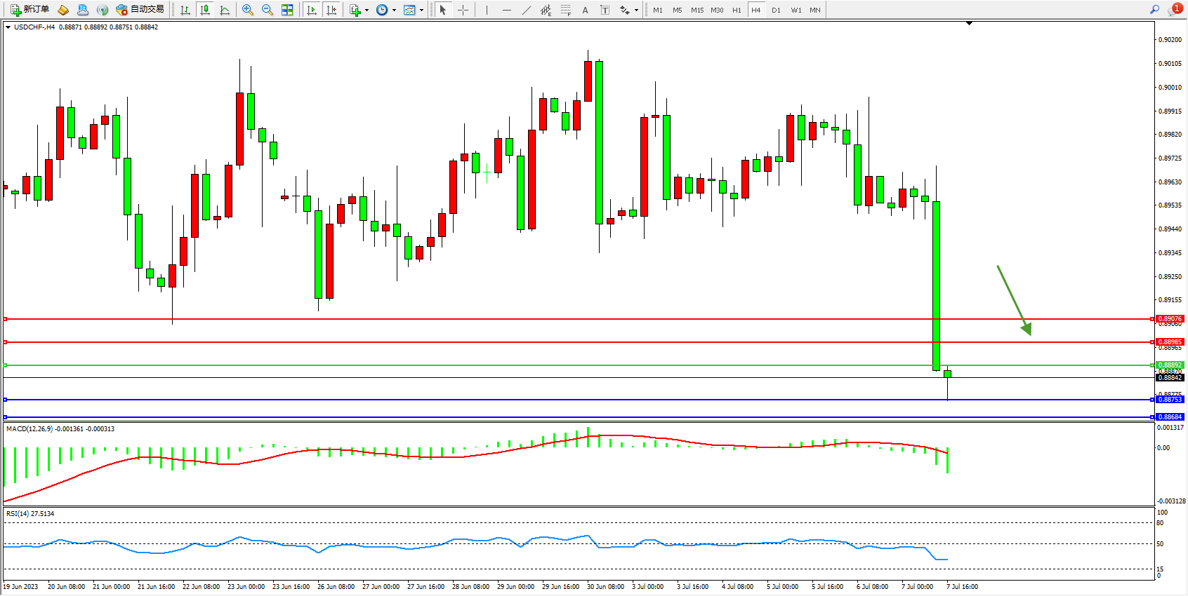 美元瑞郎USDCHF——4小时K线图显示: