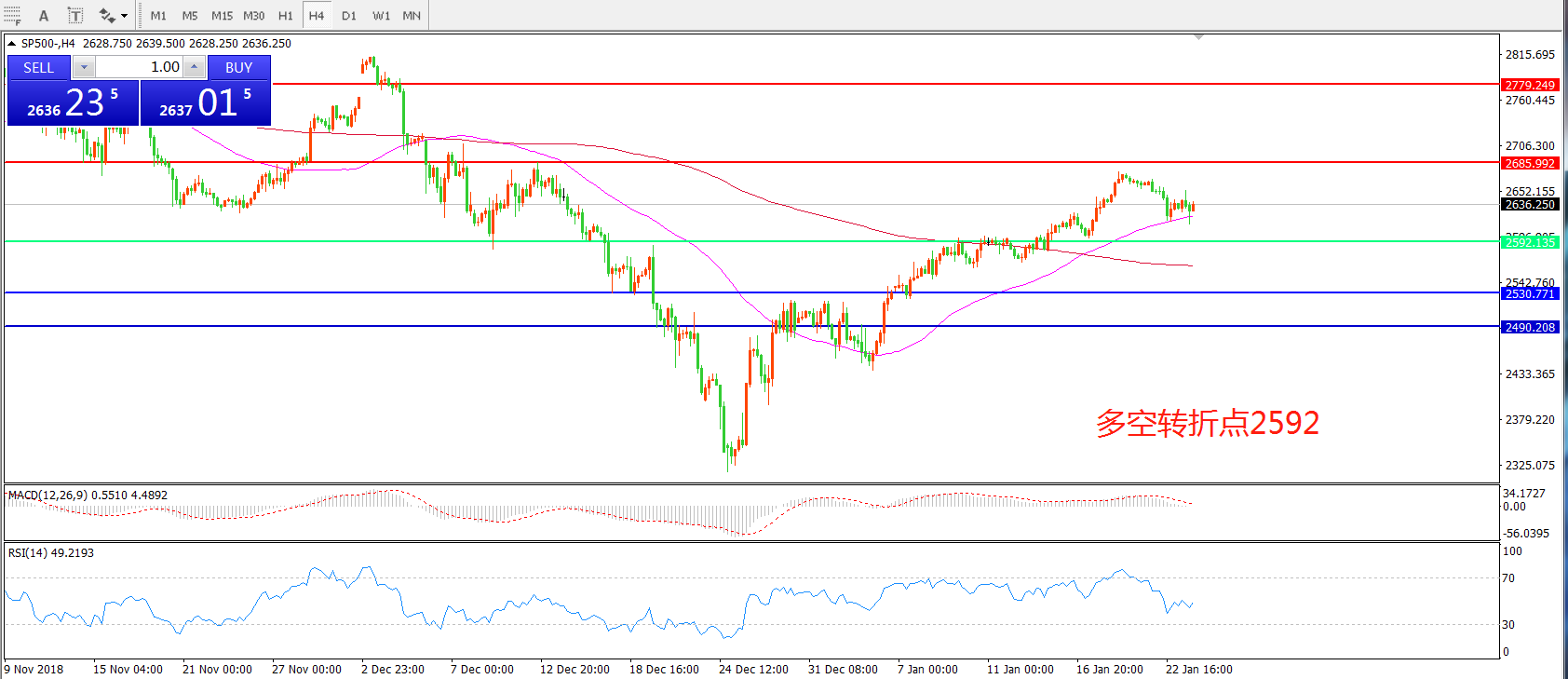 4小时图看,SP500近期逐渐站稳200周期均线,短期55均线有拐头上升迹象,MACD红柱缩短,小幅反弹成为可能。