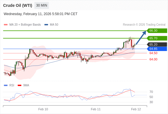 在 64.50 之上,看涨,目标价位为 65.70 ,然后为 66.30 。