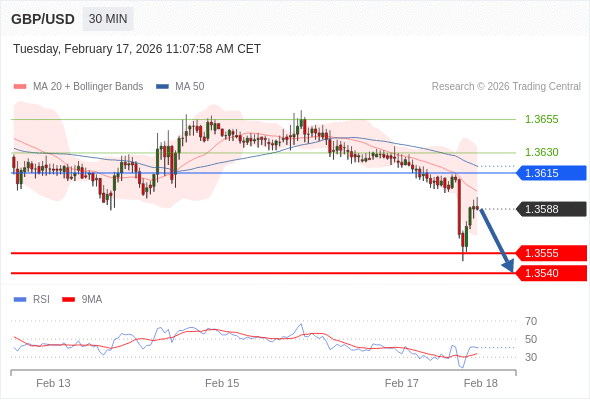在 1.3615 之下,看跌,目标价位为 1.3555 ,然后为 1.3540 。