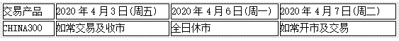 因应中国大陆2020年4月4日(周六)至4月6日(周一)清明节假期,沪深300指数CHINA300的将于4月6日(周一)全日休市,敬请阁下留意知悉!