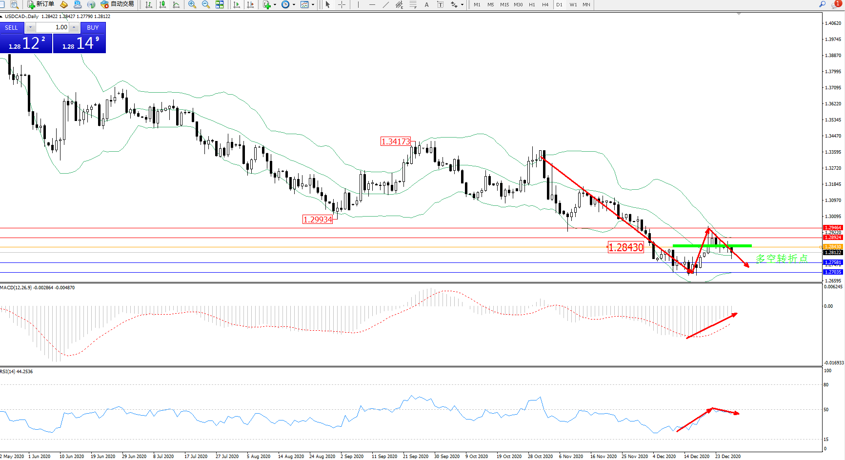 美元加元USDCAD——日K线图显示: