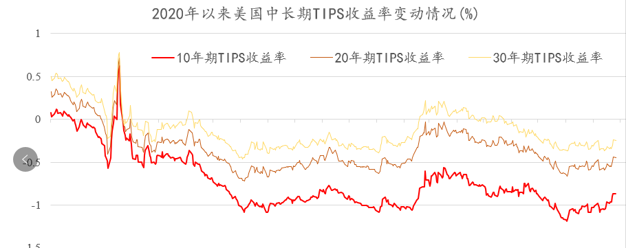 自2020年疯狂印钞以来,美联储购买了相当一部分TIPS,而TIPS每天的收益率,也是由美国财政部公布的。在财政部和美联储的“共同管理”下,最近一年半来,所有年限TIPS的收益率都变成了不可思议的负值,再加上美联储对美国中长期国债收益率的操纵,结果就是