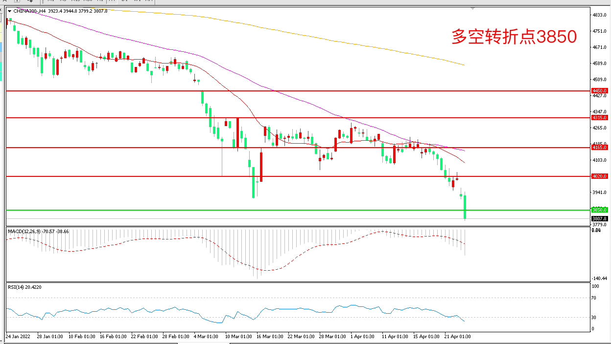 4小时图看,沪深300低开低走,短线走势极度低迷,均线系统成为上方阻力,3850成为多空分水岭,MACD绿柱增加,RSI指标走平,日内震荡下行概率较大。