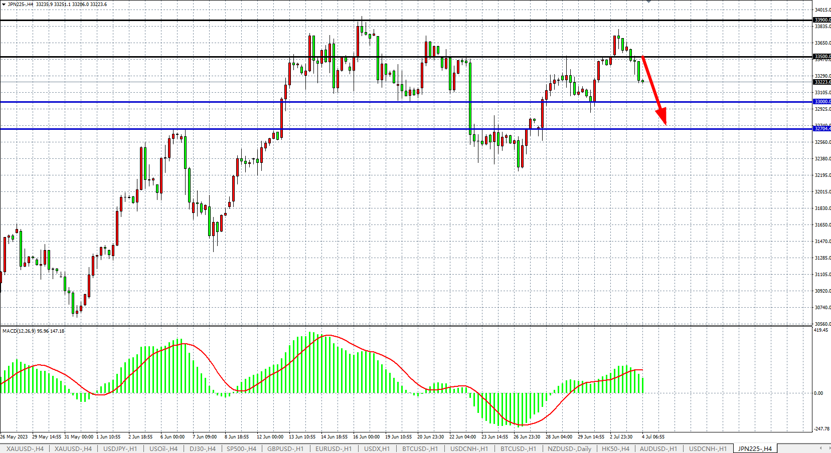 4小时图看,日经指数在33900之下受阻回落,MACD量能于零轴之上开始萎缩,趋势调整力度加大,阻力关注33500-33900,支撑关注33000、32700。